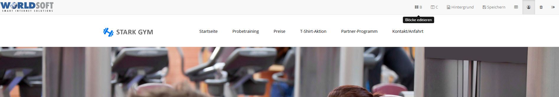 Mit dem Worldsoft Visual Editor (WVE) erstellen Sie die Website im WYSIWYG-Modus. Es gibt also kein "Start-Menü" mehr. Sie haben die Funktionen auf der Website selbst. Im Moment finden Sie die Funktionen oben wie unten abgebildet. Wir werden jedoch noch eine Option machen, dass Sie das WVE-Menü auch unten einblenden können. Diese Option folgt demnächst.